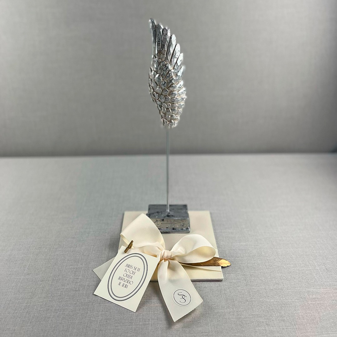 Diseño exclusivo y sofisticado: Escultura de ala en color dorado y plateado con un acabado detallado junto con una base negra o plateada que aporta estabilidad y estilo.
