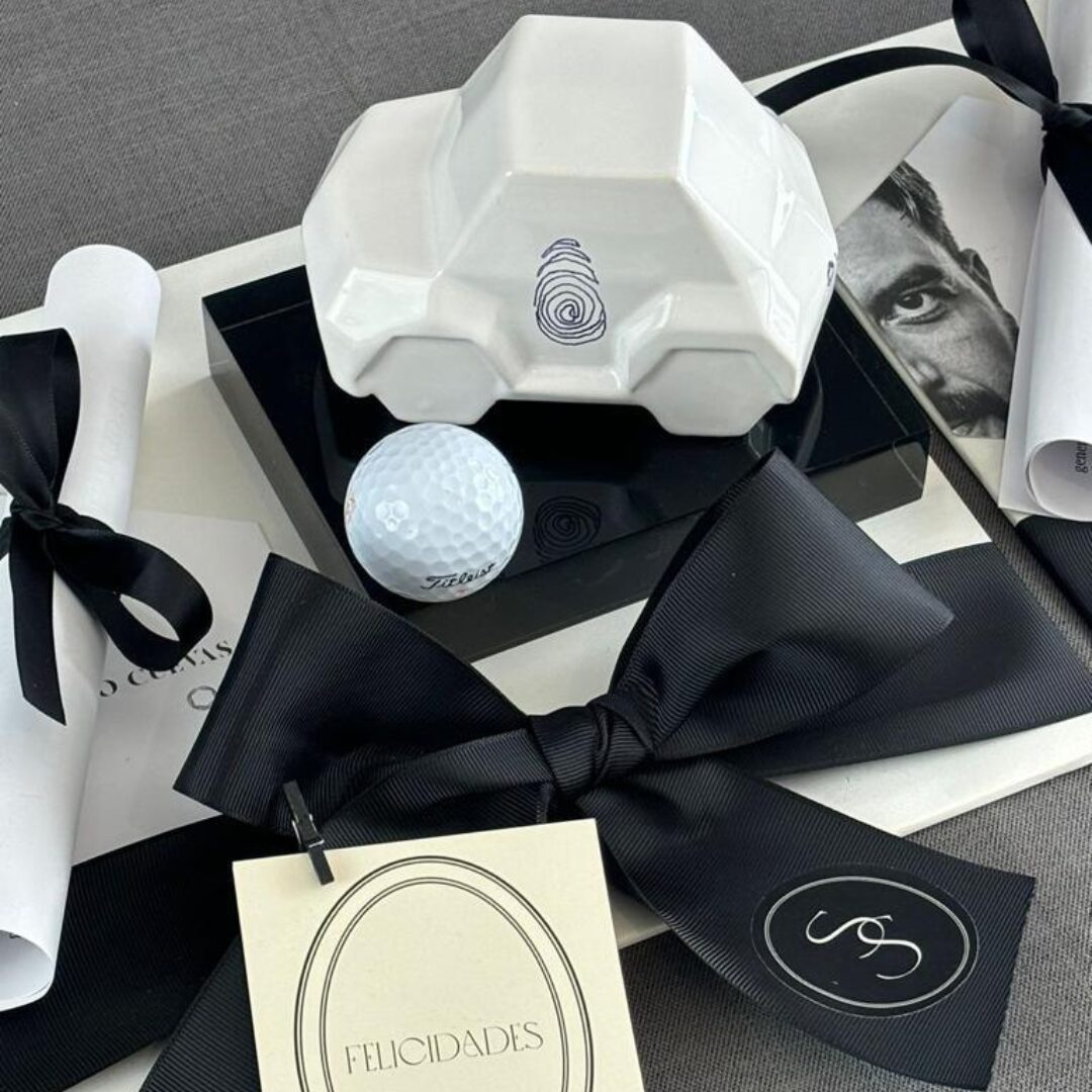 Carrito de golf de Álvaro Cuevas con pelota y certificado con base de acrílico negra de doble cara…