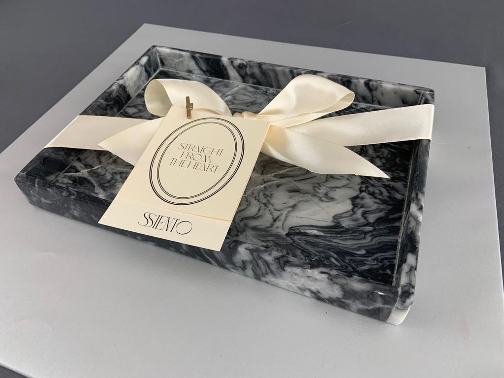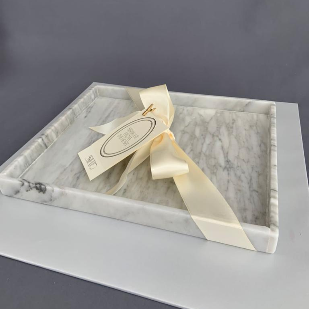 Charola de mármol de 31 cm de largo por 27 cm de ancho.