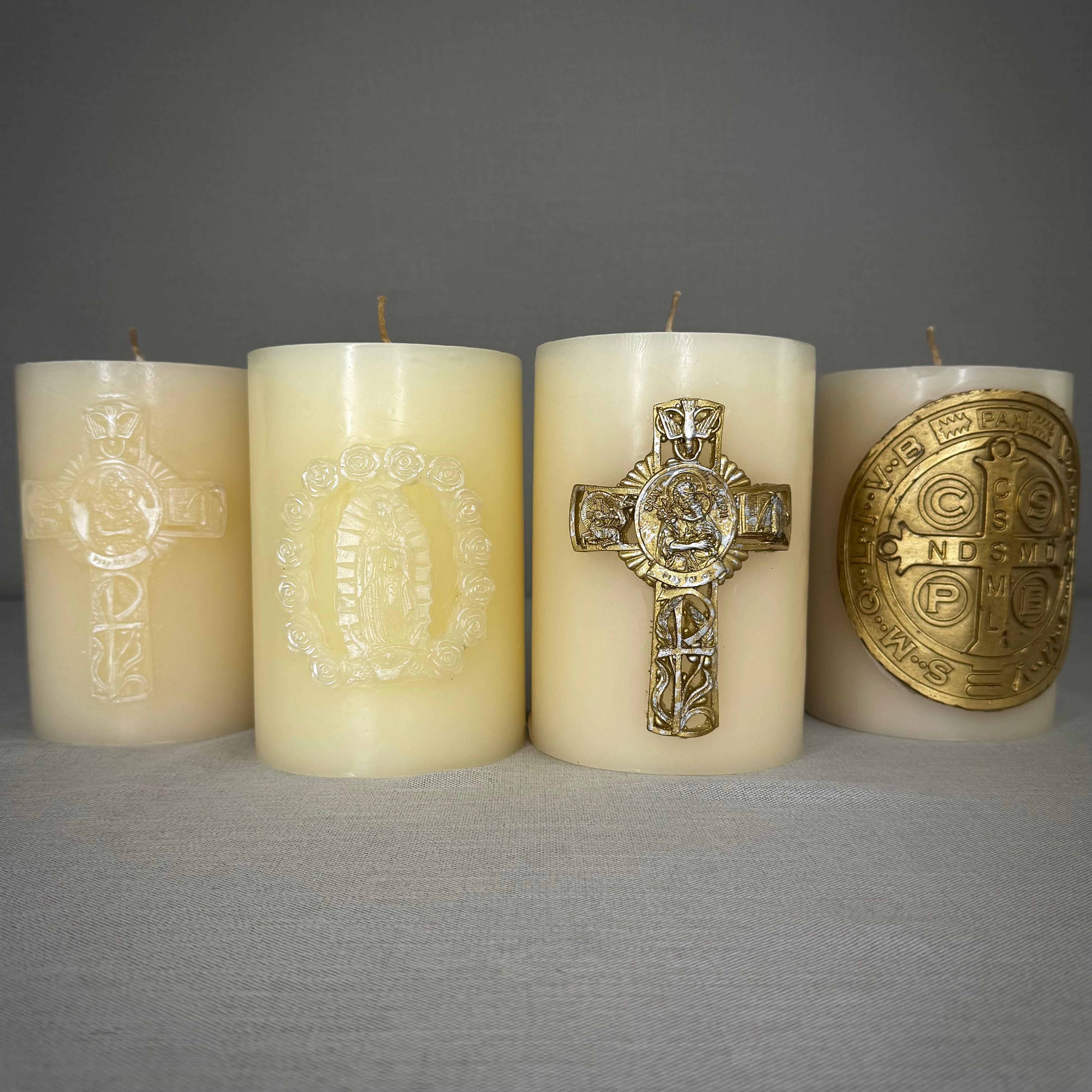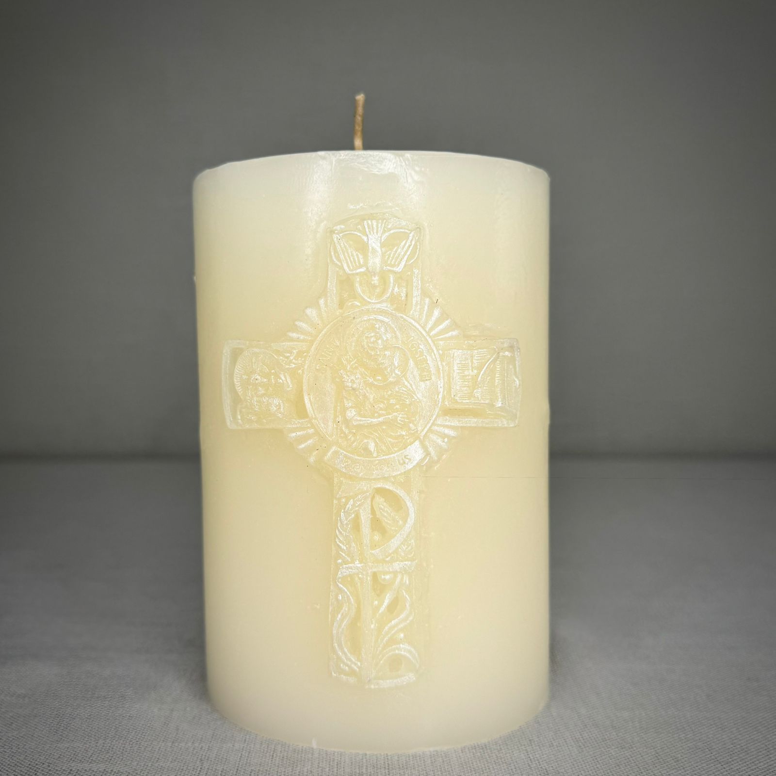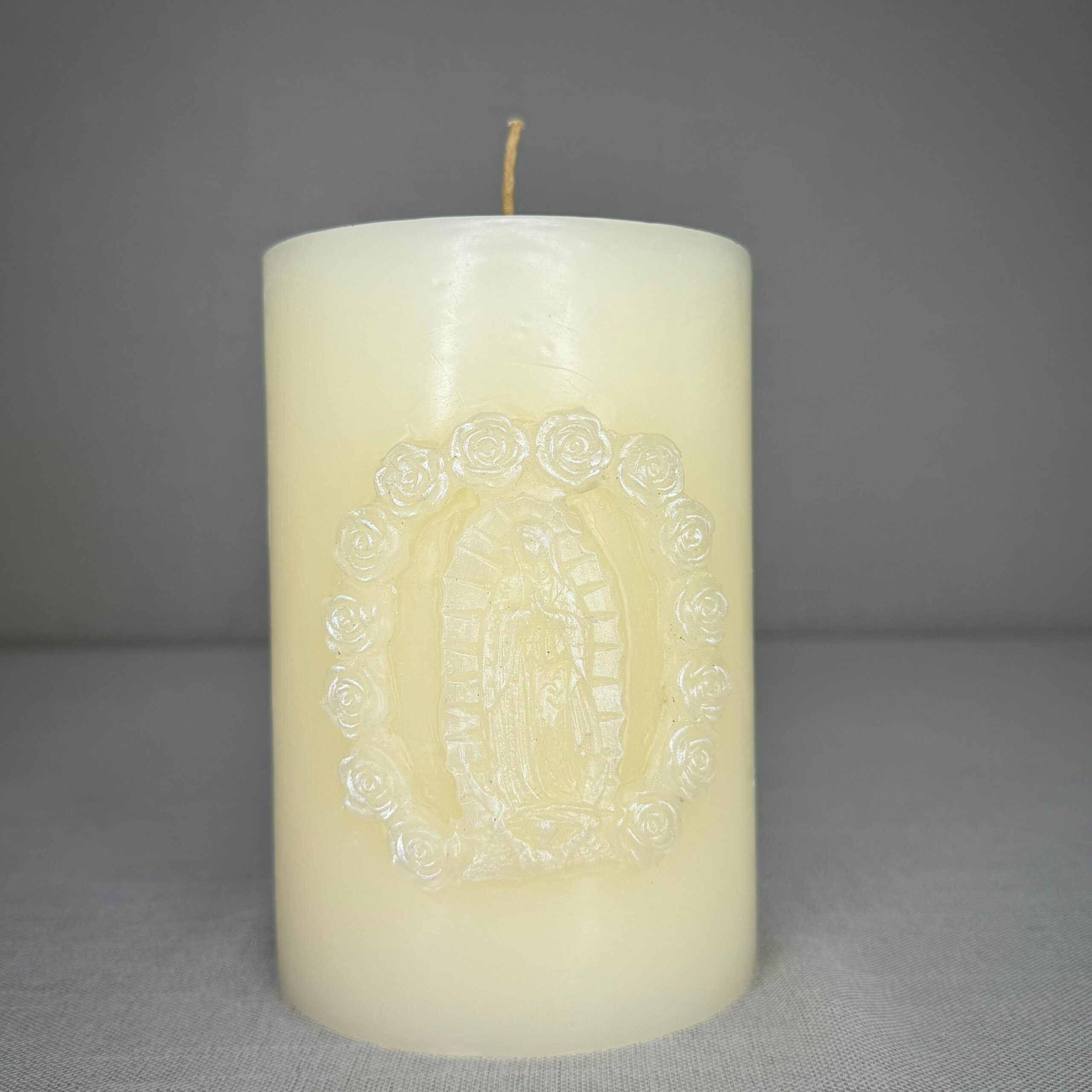 Cirio con una altura de 15 cm y un ancho de 10 cm. Este cirio puede complementarse con una base decorativa.