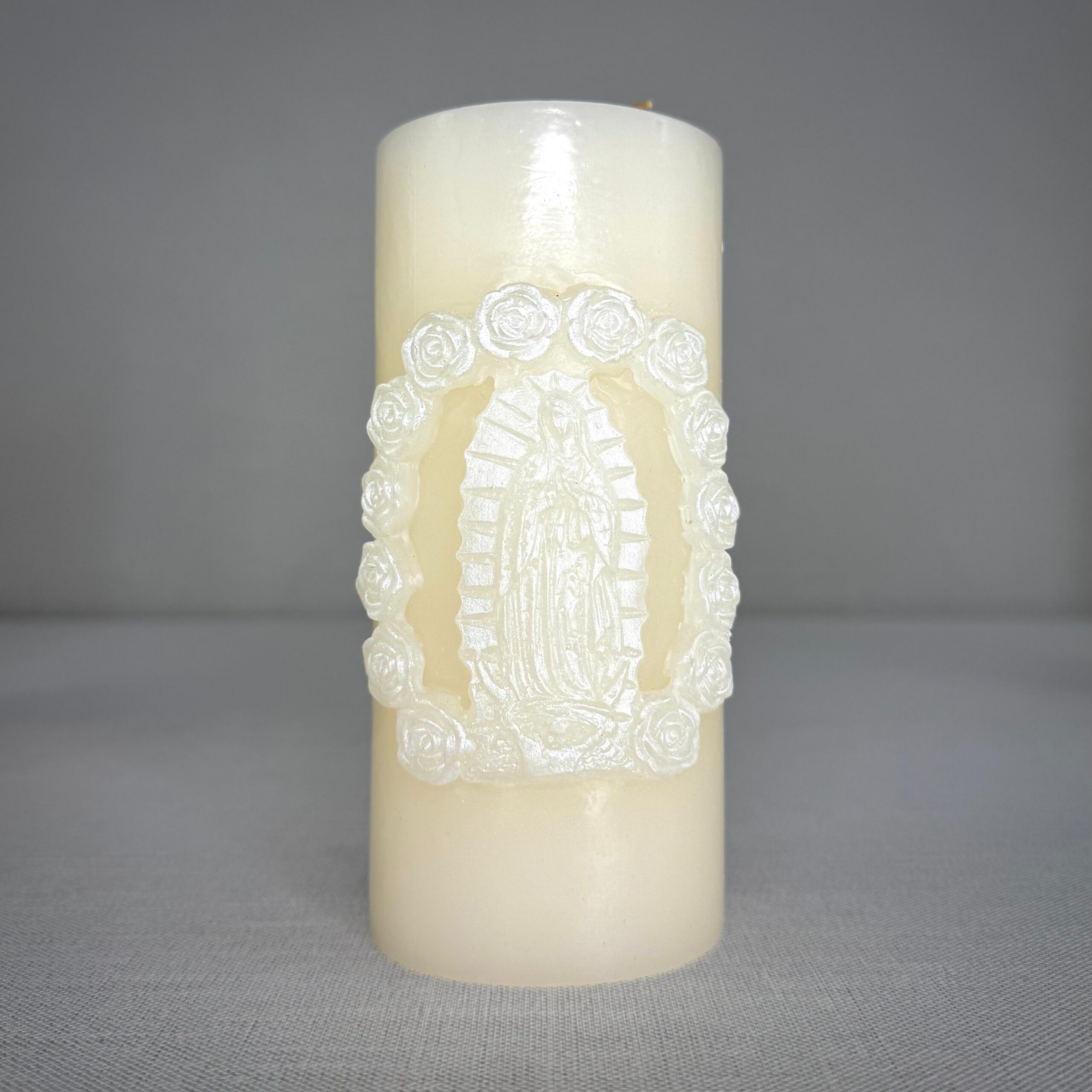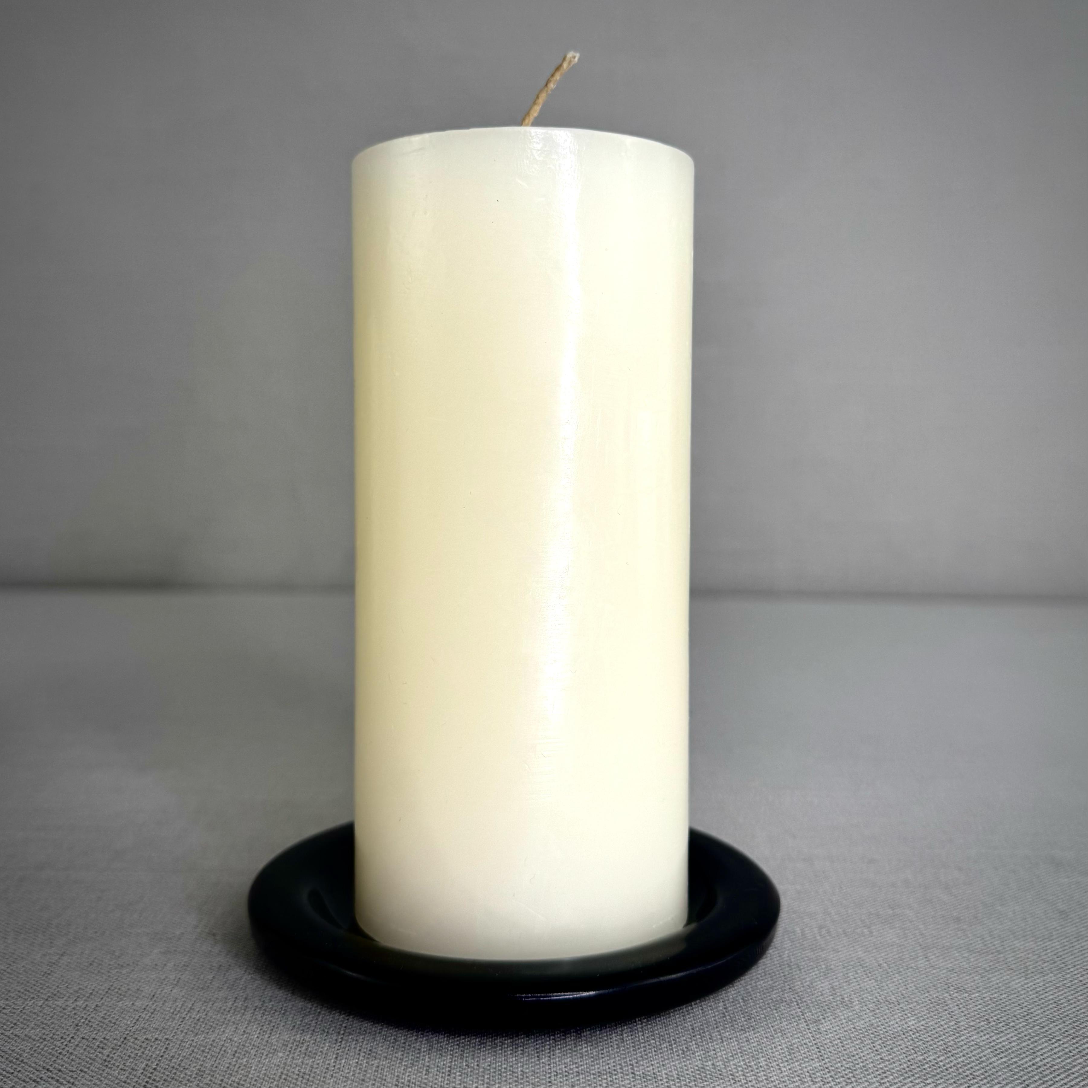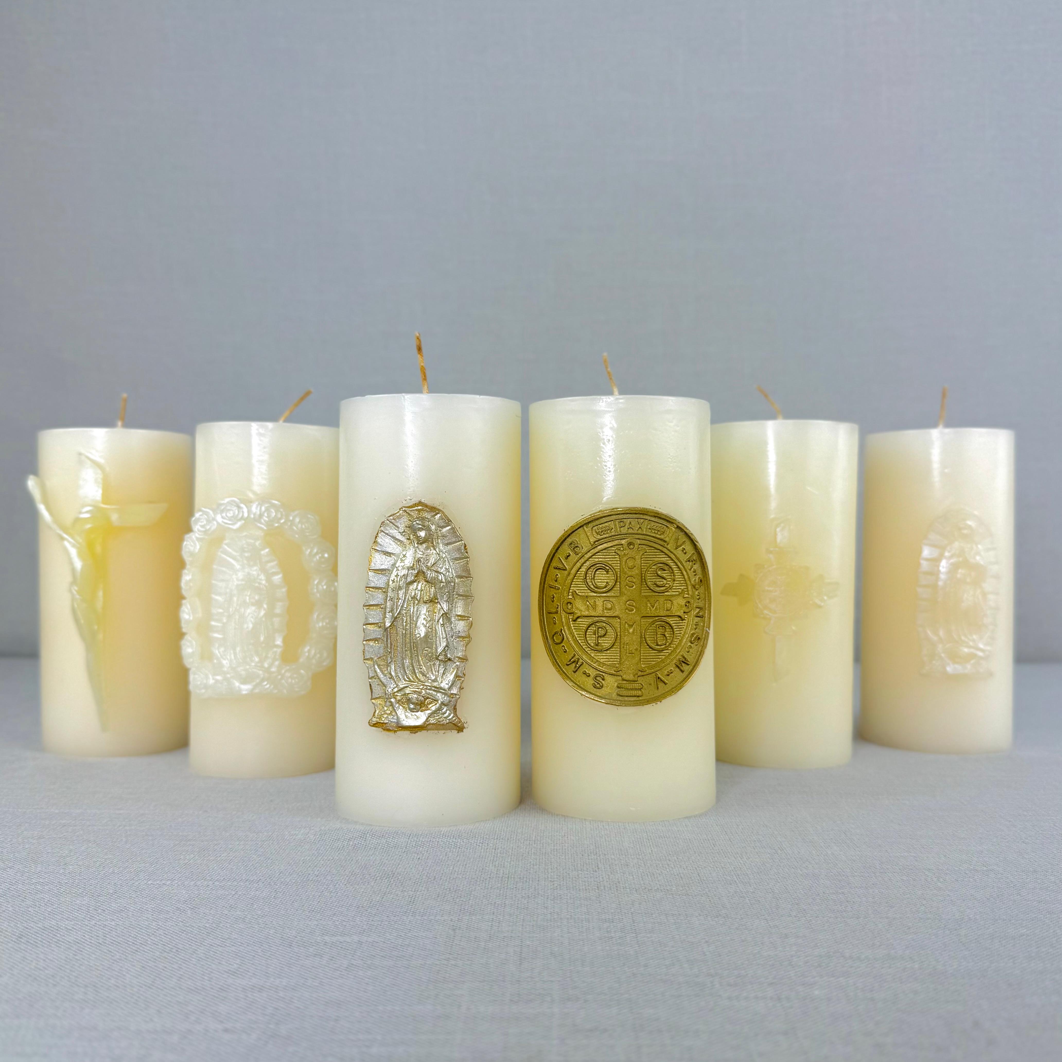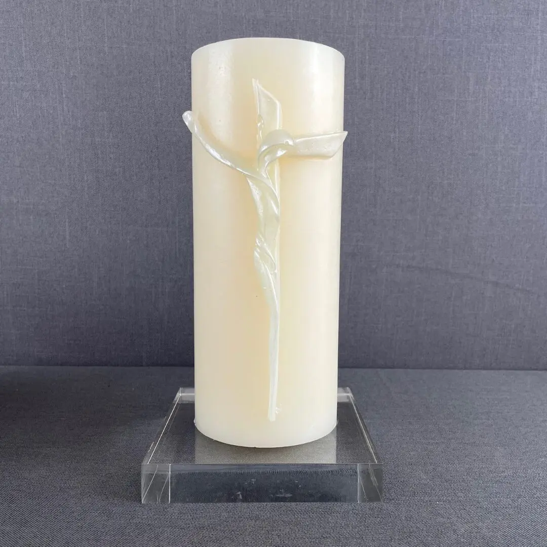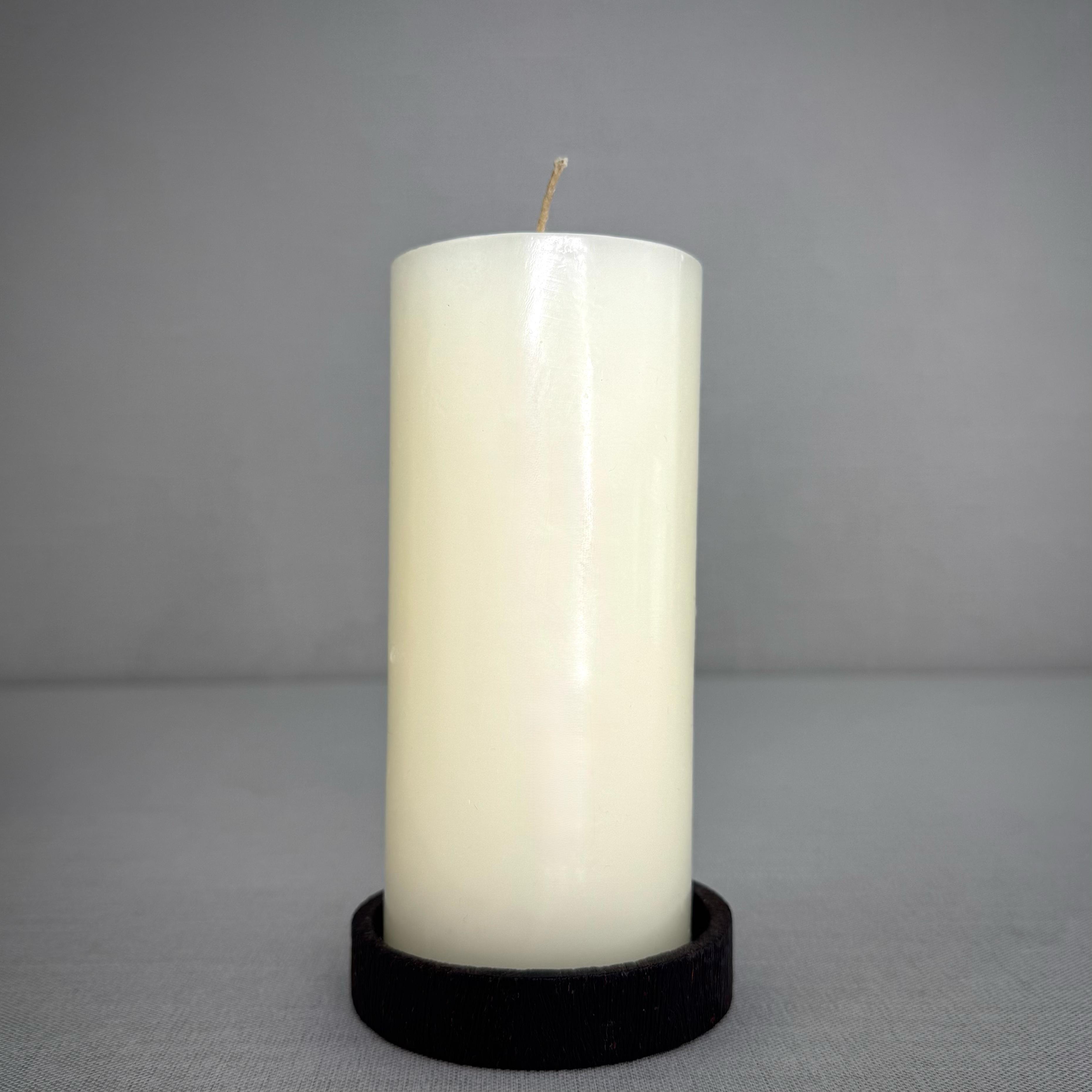 Cirio con 15 cm de alto por 7 cm de ancho, elaborado con parafina de alta calidad. Este cirio puede complementarse con una base decorativa.