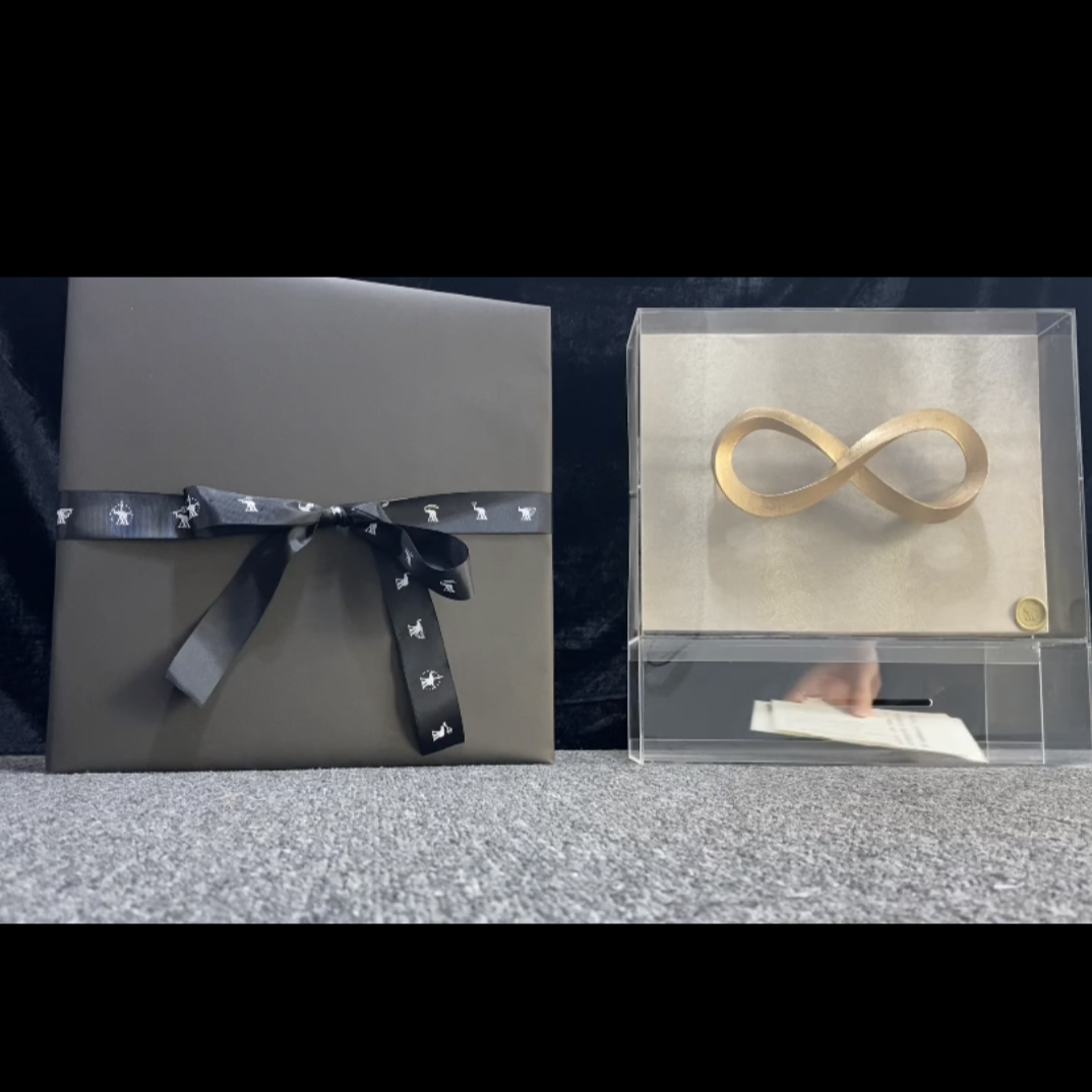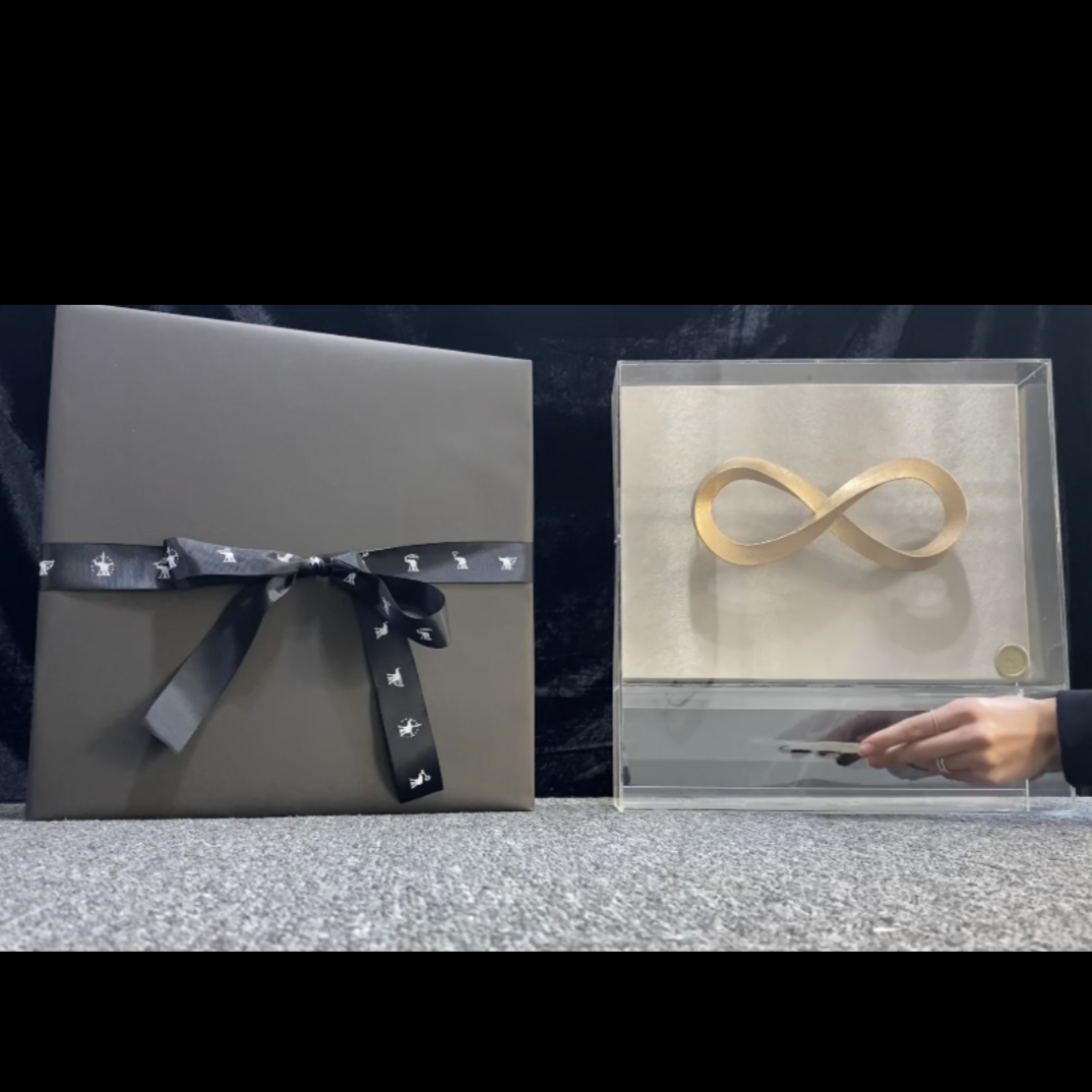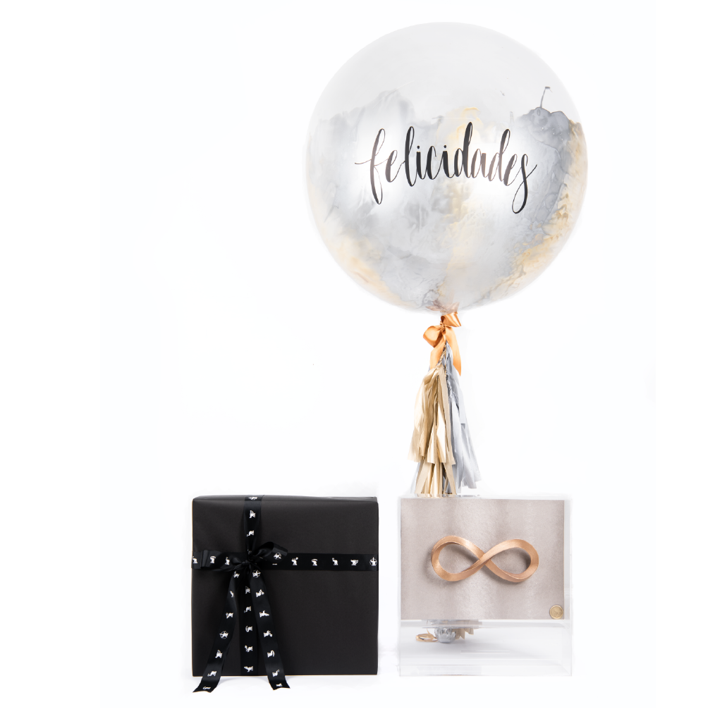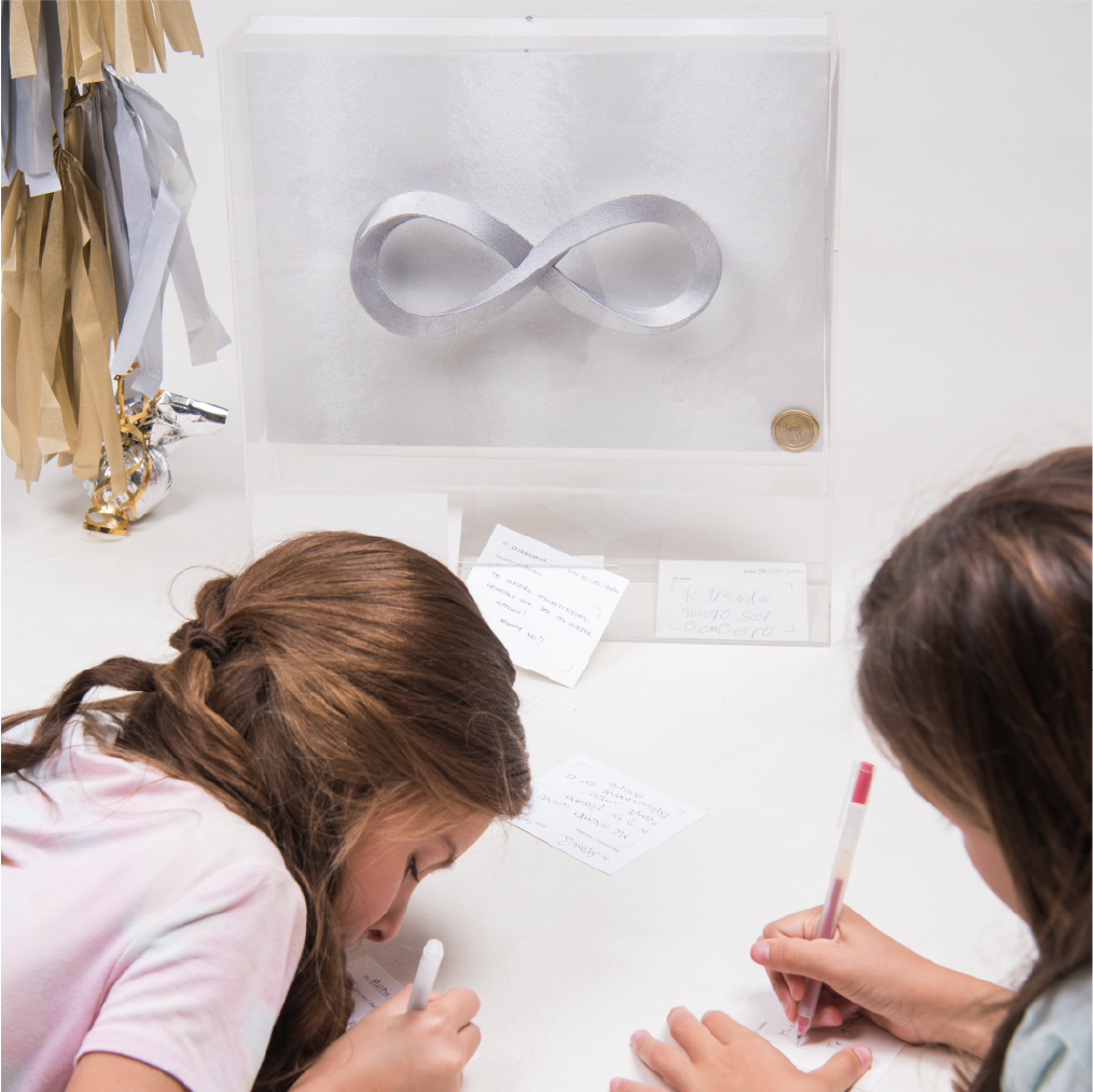 Esta caja de acrílico tiene acabado en resina rosegold o plateado, con un símbolo de infinito y 24 tarjetas para que familiares y amigos escriban mensajes, anécdotas o recuerdos.
