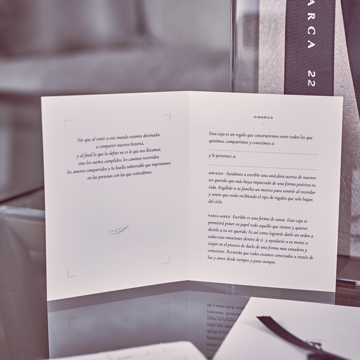 Detalle con caja de acrílico, pluma y 24 tarjetas para que familiares y amigos escriban mensajes o anécdotas en memoria de un ser querido. Ideal para momentos de despedida o aniversarios luctuosos.