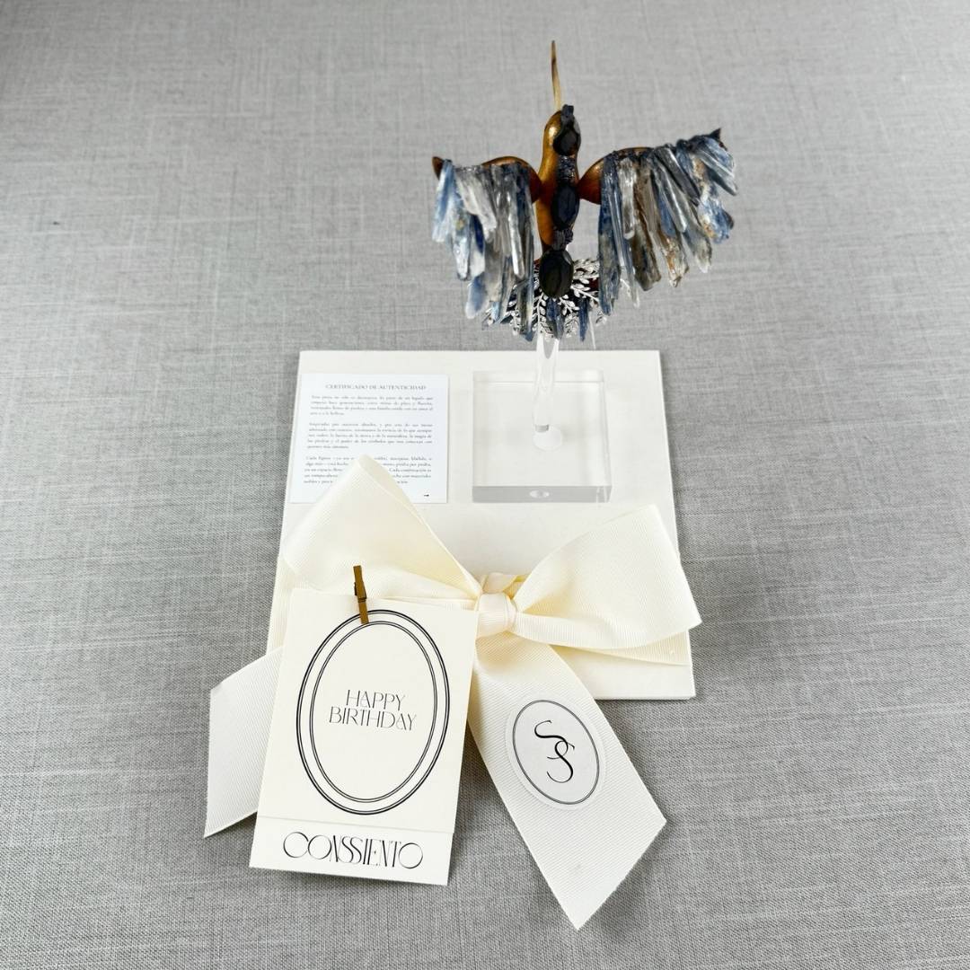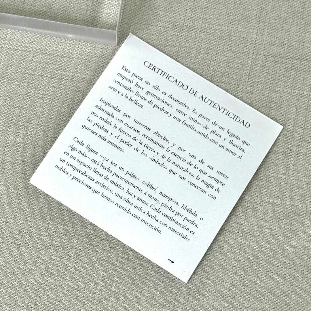 Los tonos de los cuarzos y los colores del colibrí pueden variar según la disponibilidad del momento, ya que cada uno se realiza artesanalmente con materiales naturales.