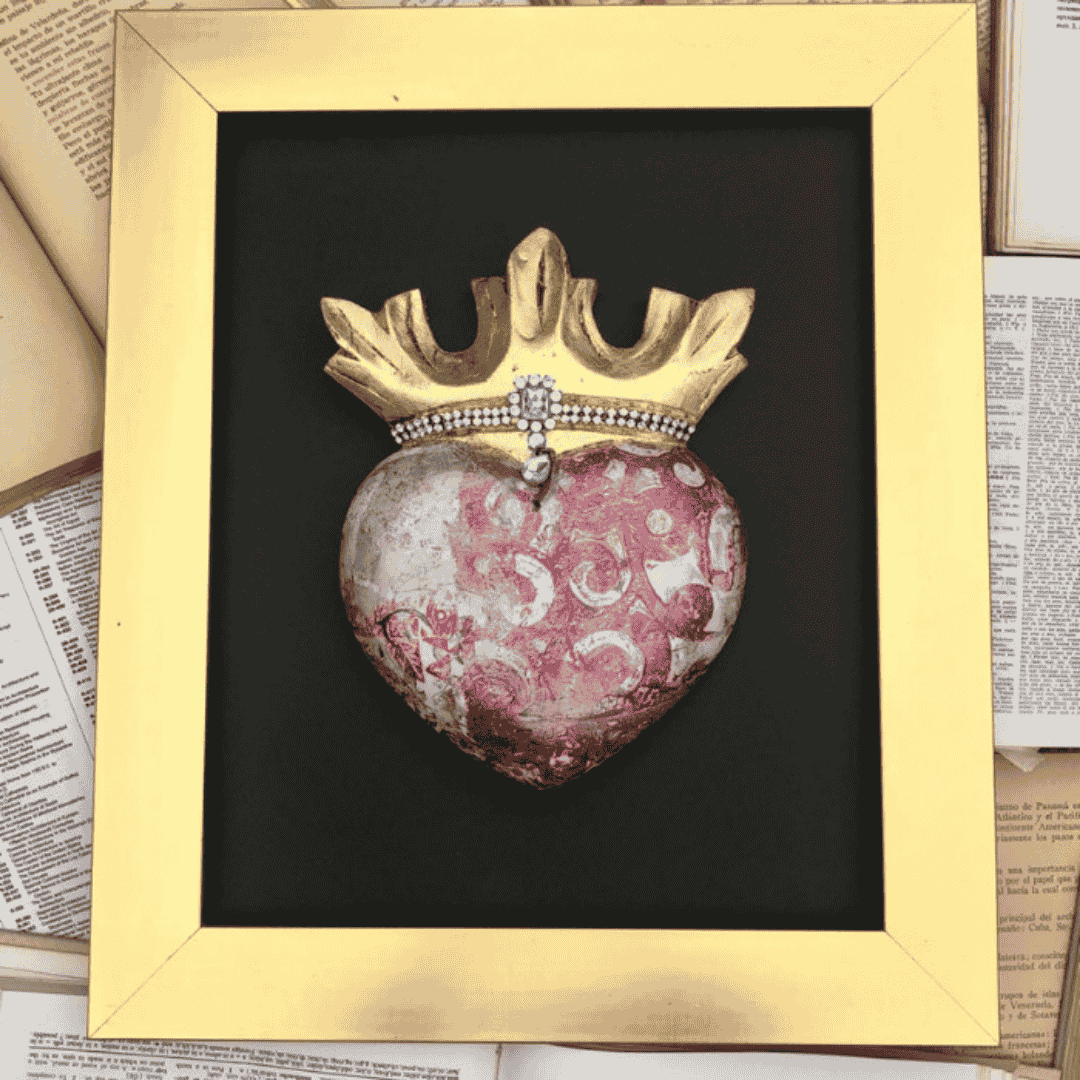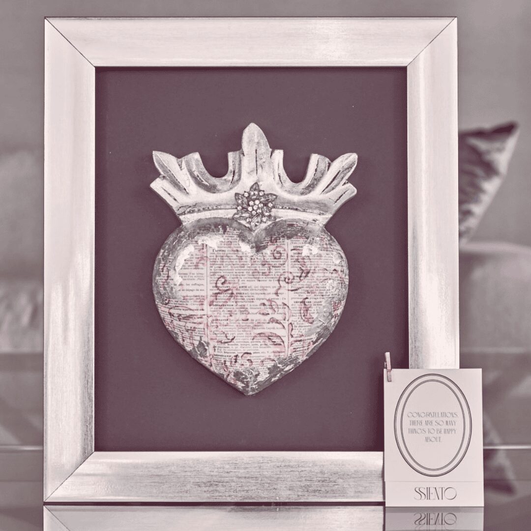 Corazón de madera con decoupage y hoja de oro y plata, sobre marco