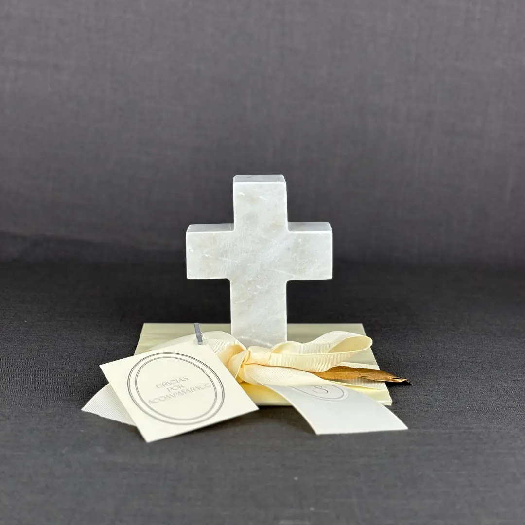 Cruz blanca de mármol, elaborada en piedra natural de 12×15×4 cm.