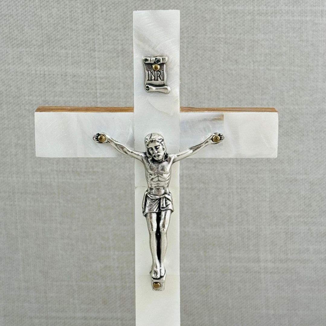 Una pieza sagrada traída desde Tierra Santa, elaborada con madera de olivo y finos detalles en madre perla.