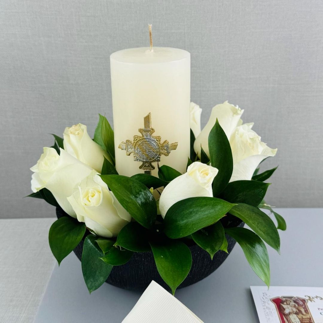 Kit de cirio en bowl con rosas blancas y misa anual incluida. Incluye cirio de 7×15 cm sobre base de parafina, 6 rosas frescas y follaje natural. El modelo del cirio puede variar.