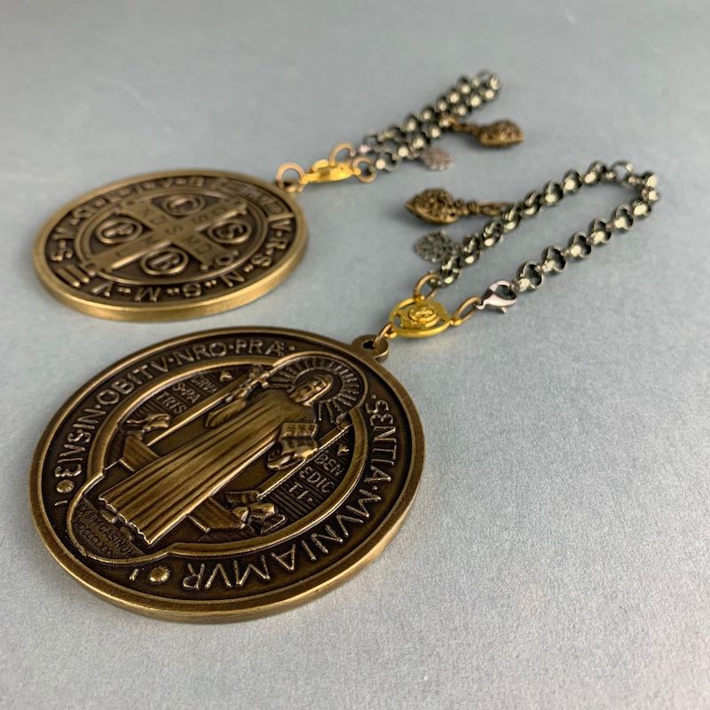 Hermoso medallón de San Benito elaborado por Laura Cantú, puedes colocarlo detrás de la puerta como bendición para tu hogar o espacio.